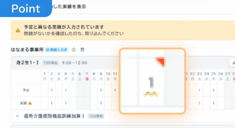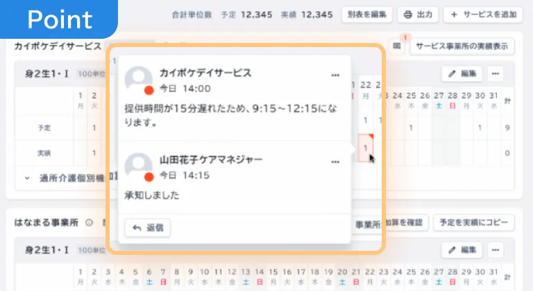 ケアマネジャーは実績を取り込む前に内容を確認できるので、共有された実績が予定と違っていてもすぐに気づけます。